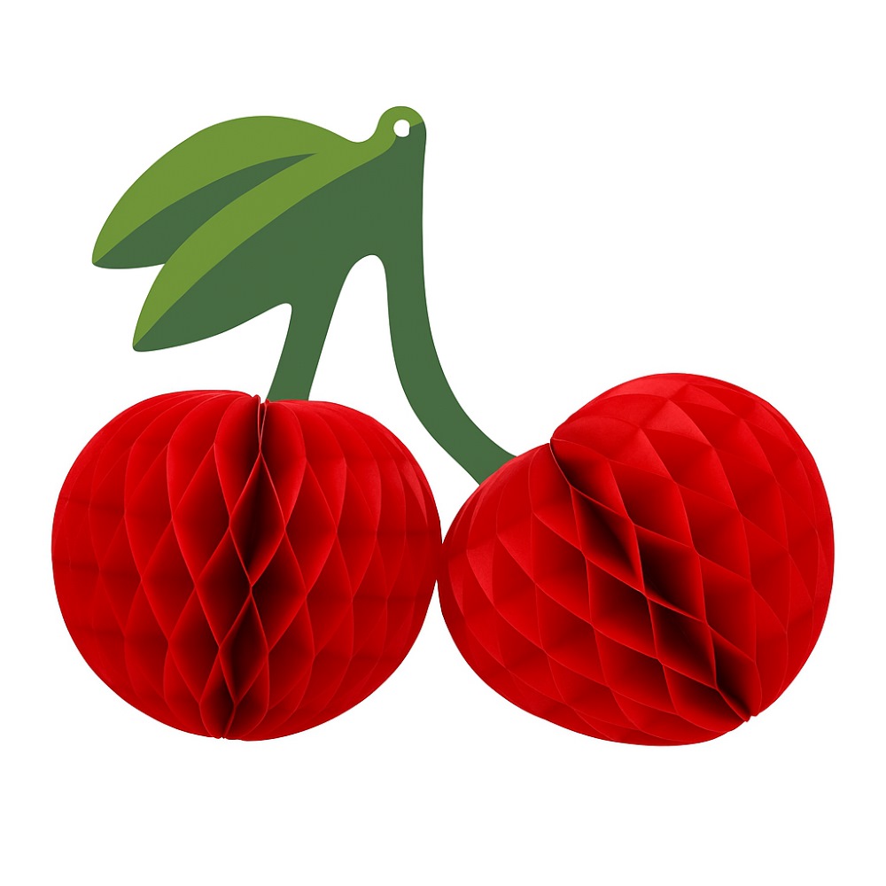 Объёмное украшение в форме вишни — лёгкий и выразительный элемент праздничного декора. Плод выполнен из нежной бумаги тишью, создающей воздушный объём, а веточка и листья — из прочного картона, что обеспечивает устойчивую форму и аккуратный внешний вид.