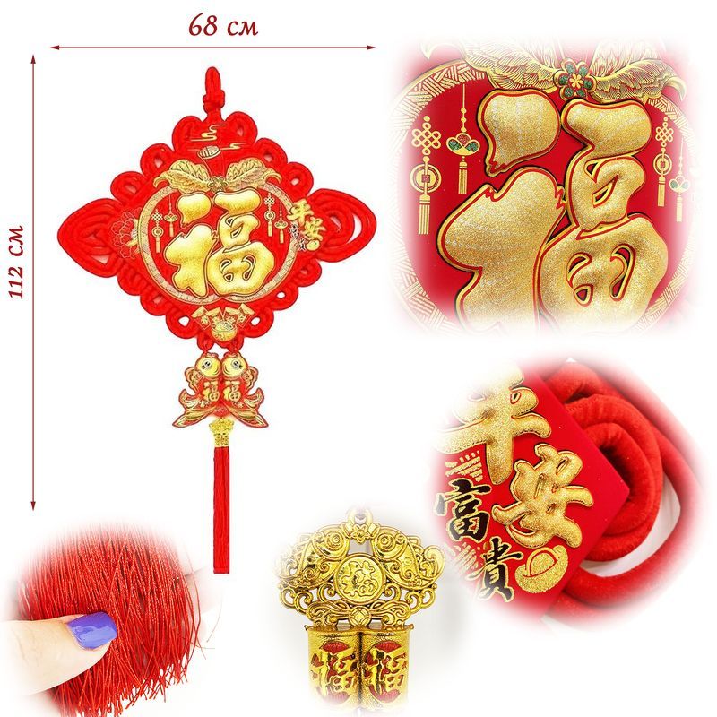 Традиционный китайский узел в форме ромба с символичным дизайном. Яркое сочетание красного бархата и золотых элементов создает эффектный акцент в интерьере.